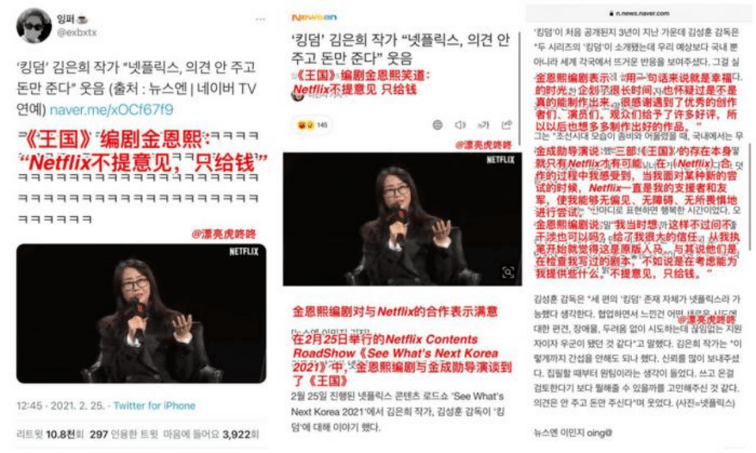 《王国》的编剧金银姬在一场直播会上一句奈飞“不提意见只给钱”的发言,她说:“Netflix给予了无限的创作自由,在内容和技术方面,根本没有说过‘要怎么做’”,这曾经馋死了多少国内影视工作者。