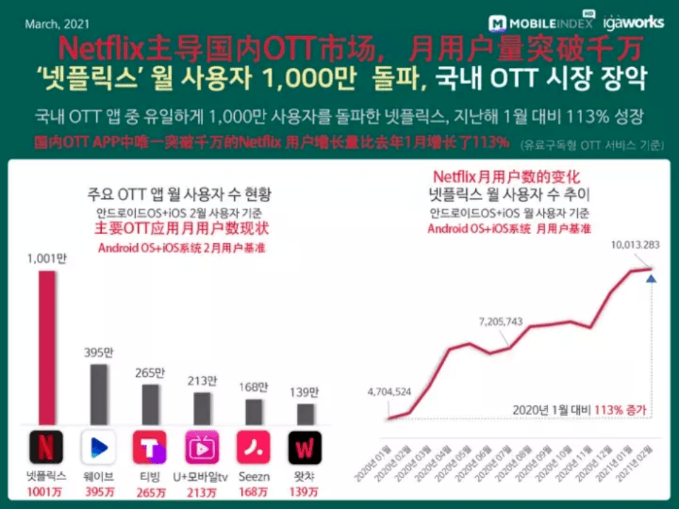根据韩国移动大数据公司IG Works发布的一份名为《国内OTT应用市场分析》的报告显示,2021年2月,Netflix的Android OS和iOS系统用户的总数已突破1000万,与2020年1月(470万)相比,增长了113%。报告分析称Netflix每次发布新的剧集作品时,都会迎来新一波用户入驻高潮。