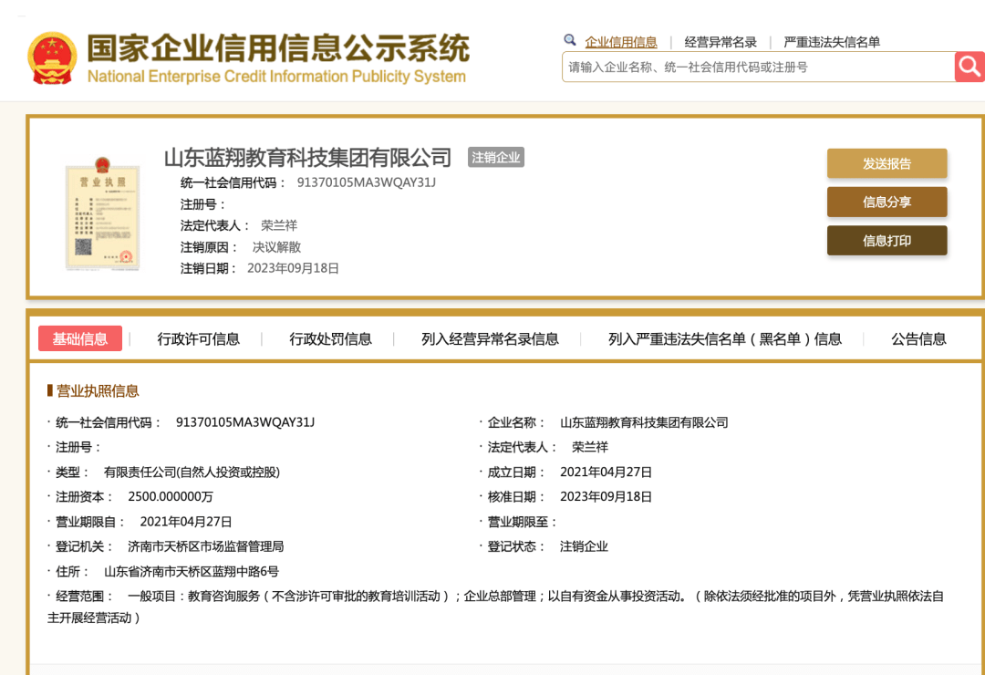 国家企业信用信息公示系统网站显示,山东蓝翔教育科技集团有限公司已于近日注销。注销原因为:决议解散。