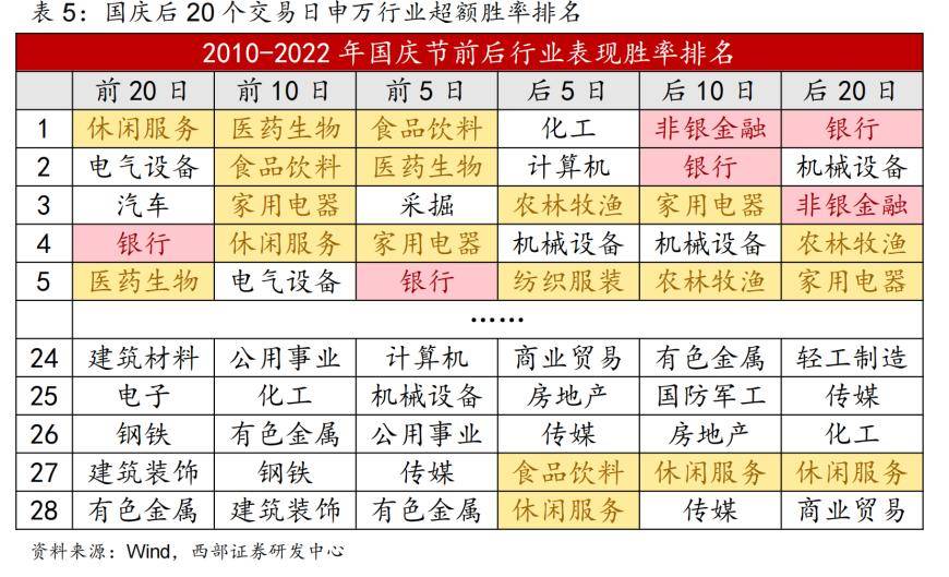 从结构来看,国庆前后消费行业相对占优,金融的配置价值在节后逐渐显现。西部证券统计了2010-2022年中信风格指数与申万行业相对万得全A的平均超额收益率以及超额胜率,消费在过去国庆前20个交易日内均有较好的市场表现,前5/10/20个交易日中分别取得了1.27%/1.64%/0.66%的平均超额收益率,代表性行业医药生物、食品饮料、家用电器与社会服务等。