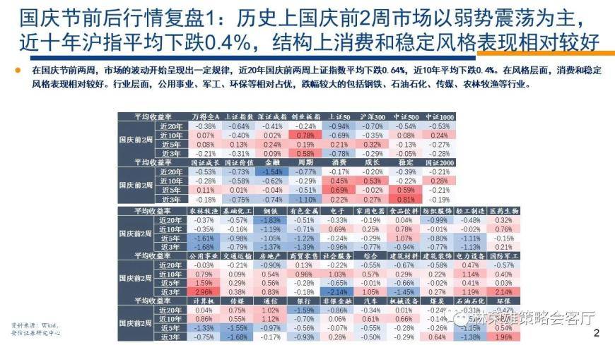 安信证券林荣雄在9月14日发布的研报中复盘近二十年来国庆假期前后A股市场的表现规律。在国庆节前夕,市场的波动就开始呈现出一定规律,近20年国庆前两周上证指数平均下跌0.64%,近10年平均下跌0.4%。在风格层面,消费和稳定风格表现相对较好,整体偏向防御。从收益率来看,国庆节前5个交易日出现普跌,节后5个交易日反弹上涨明显。