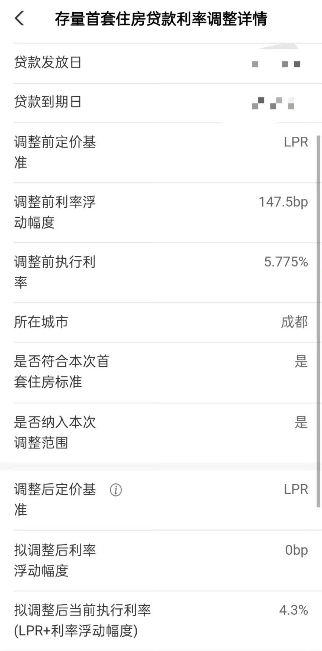 在社交媒体上,也有不少网友晒出自己的喜悦。有网友的房贷利率是LPR+75个基点,银行App显示,拟调整后利率信息为LPR+0,执行利率从5.05%降到了4.3%。还有网友的利率加点从147.5个基点下降到了0基点,利率从5.775%降到了4.3%。