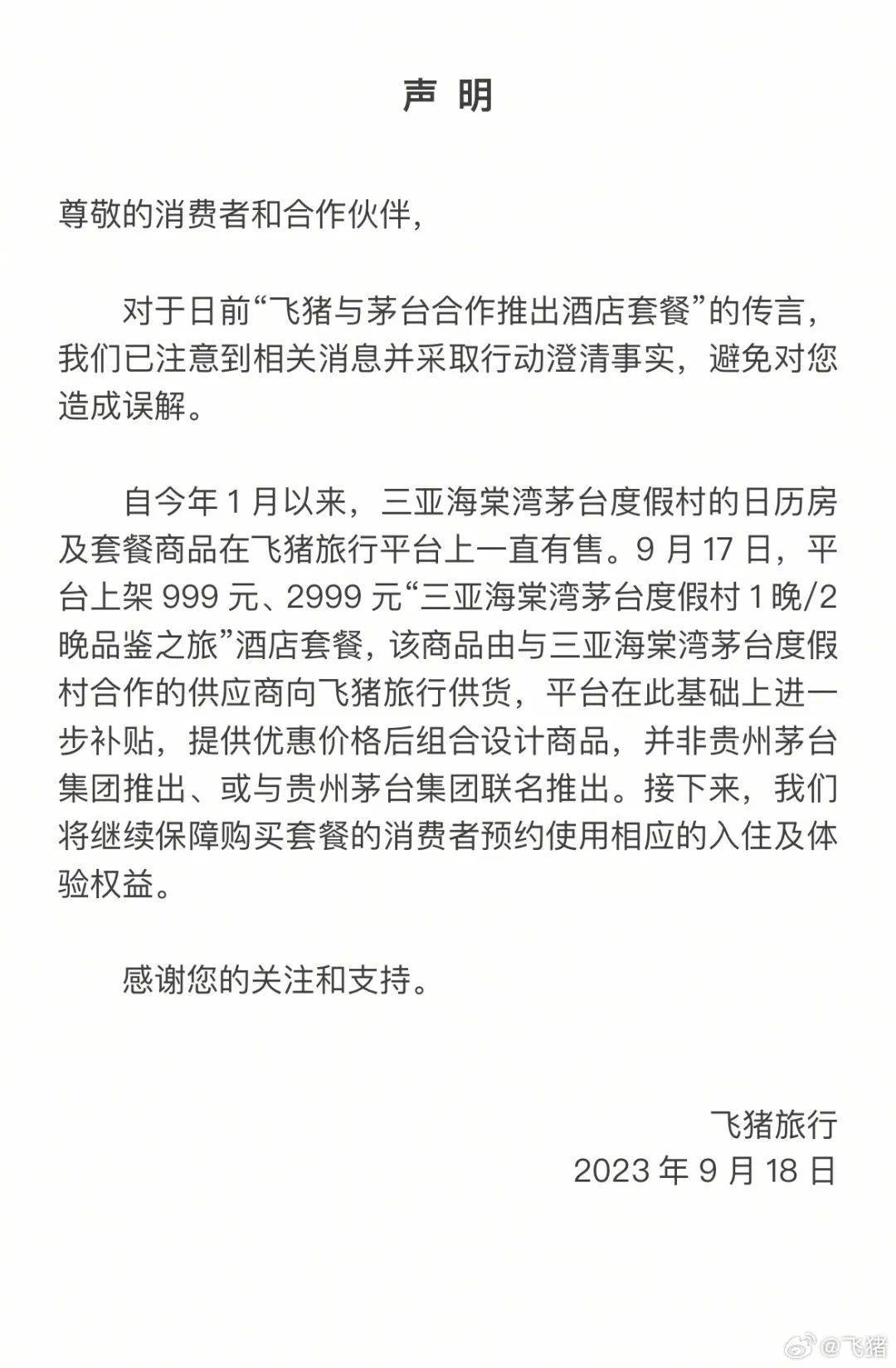 飞猪称,自今年1月以来,三亚海棠湾茅台度假村的日历房及套餐商品在飞猪旅行平台上一直有售。9 月17日,平台上架 999 元、2999 元“三亚海棠湾茅台度假村 1晚/2晚品鉴之旅”酒店套餐,该商品由与三亚海棠湾茅台度假村合作的供应商向飞猪旅行供货,平台在此基础上进一步补贴,提供优惠价格后组合设计商品。