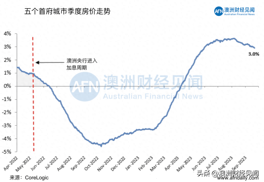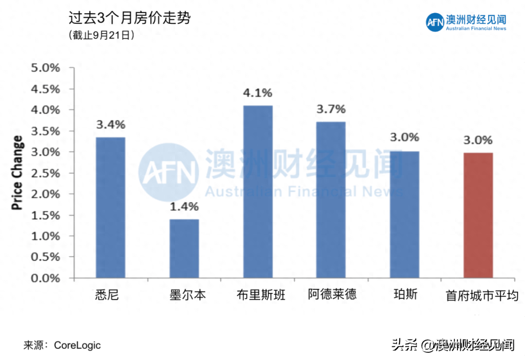 其中,布里斯班引领房价增长,过去3个月房价上涨 4.1%,其次是阿德莱德 (3.7%) 和悉尼 (3.4%)。
