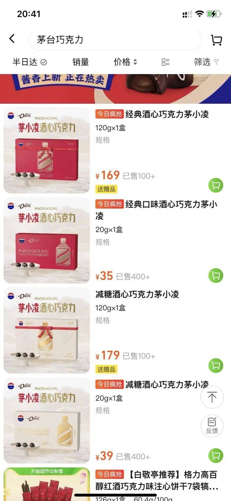 9月20日,据了解上海、武汉、长沙和遵义等多地共20家茅台冰淇淋门店的巧克力已经售罄。淘宝德芙官方旗舰店销售页面显示,店铺将于9月21日20点开售茅台联名酒心巧克力。