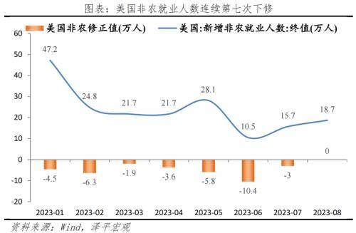 美国8月非农就业新增18.7万人,小幅高于市场预期的17万人;但6、7月新增非农就业人数共计下修约13.4万人。这也是进入2023年以来连续第7次下修,且幅度较大,例如6月非农下修比例接近50%。