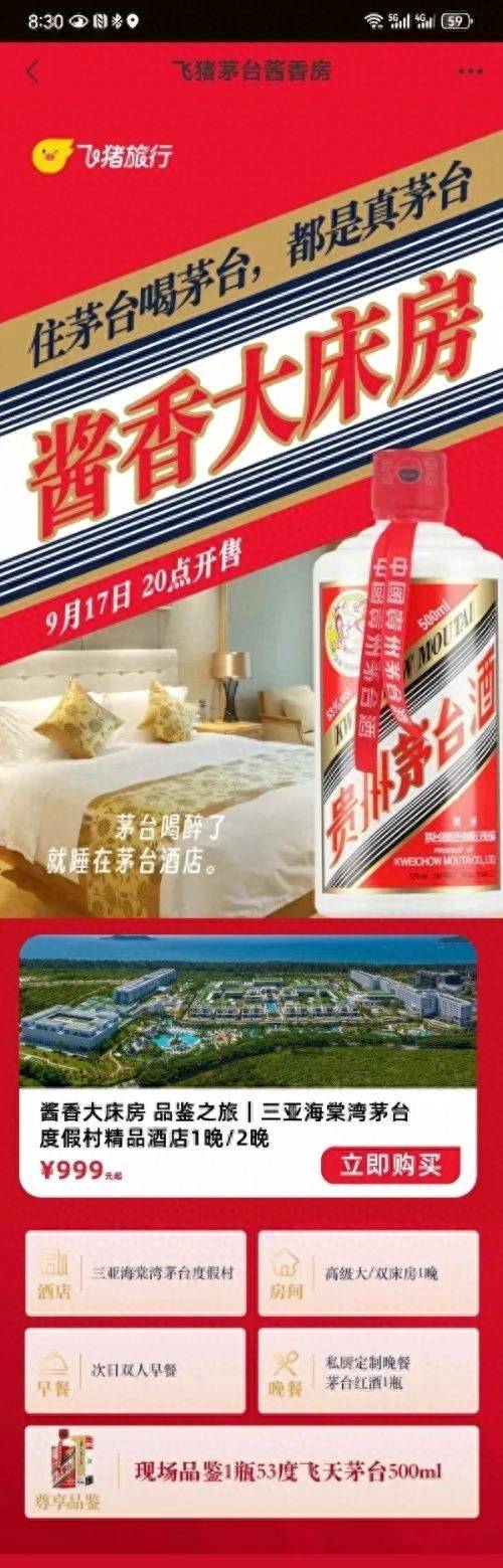 9月17日晚8点,某旅行平台开售“酱香大床房”,其中一款套餐价格999元,该价格含酒店1晚+双人早餐+晚餐套餐+茅台红酒1瓶+现场品鉴53度飞天茅台500ml一瓶。平台强调,这是10月1日国庆当天的酱香价。