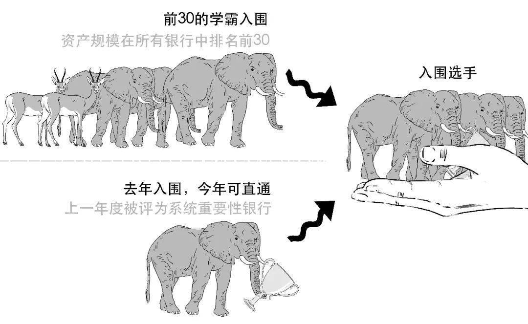 资产规模在所有银行中排名前30的,或者曾于上一年度被评为系统重要性银行的,会作为候选银行。