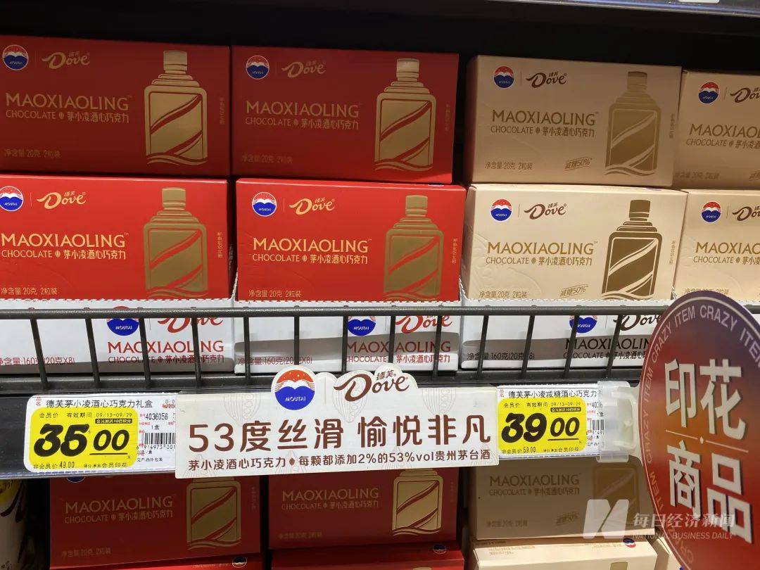 值得一提的是,净含量20克2粒装的茅小凌酒心巧克力,经典款的售价35元,减糖款的售价39元,旁边摆放的普通德芙巧克力净含量252克装(14克x18粒)售价39.5元。