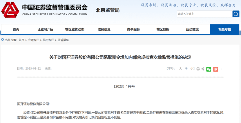 9月22日,北京证监局发布了《关于对国开证券股份有限公司采取责令增加内部合规检查次数监管措施的决定》。
