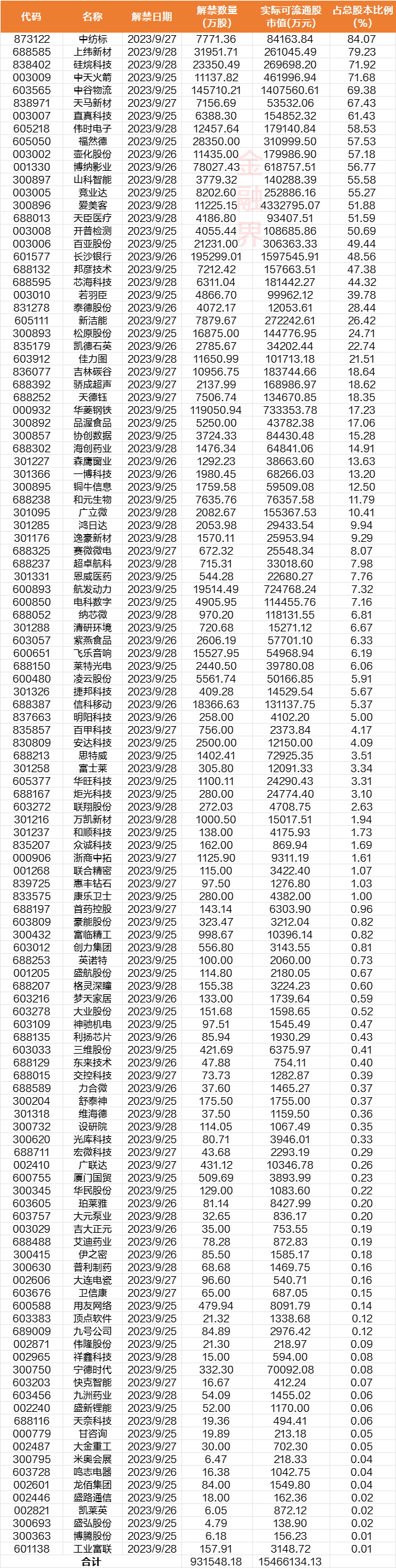 下周(9月25日-9月29日),沪深京三市有119家上市公司涉及限售股解禁,合计解禁量约93.15亿股,按最新收盘价计算,解禁市值为1546.61亿元,前一周解禁规模为97.93亿股、1213.02亿元。