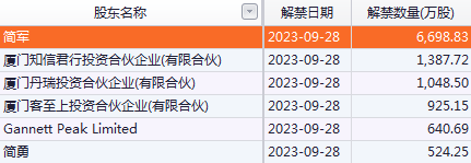 爱美客1.12亿股首发原股东限售股份将于9月28日上市流通,占解禁前流通股122.94%,占总股本51.88%,市值约为433.28亿元。明细如下: