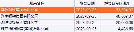 华菱钢铁11.91亿股限售股将于9月25日起上市流通,占总股本的17.23%,解禁市值为73.34亿元,此次解禁股份类型为定向增发机构配售股份。明细如下: