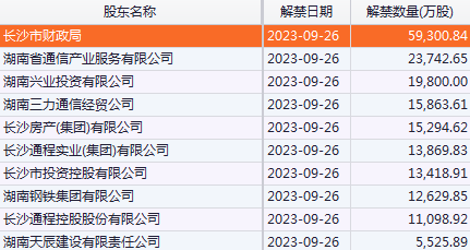 下周解禁数量最多的是长沙银行,长沙银行19.53亿股限售股将于9月26日起上市流通,占总股本的48.56%,解禁市值为159.75亿元,此次解禁股份类型为首发原股东限售股份,股东共计17位,解禁数量排前十的股东明细如下: