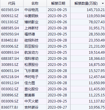 其他解禁数量较大的公司有中谷物流(14.57亿股)、华菱钢铁(11.91亿股)、博纳影业(7.8亿股)、上纬新材(3.2亿股)、福然德(2.84亿股)、硅烷科技(2.34亿股)、百亚股份(2.12亿股)等。