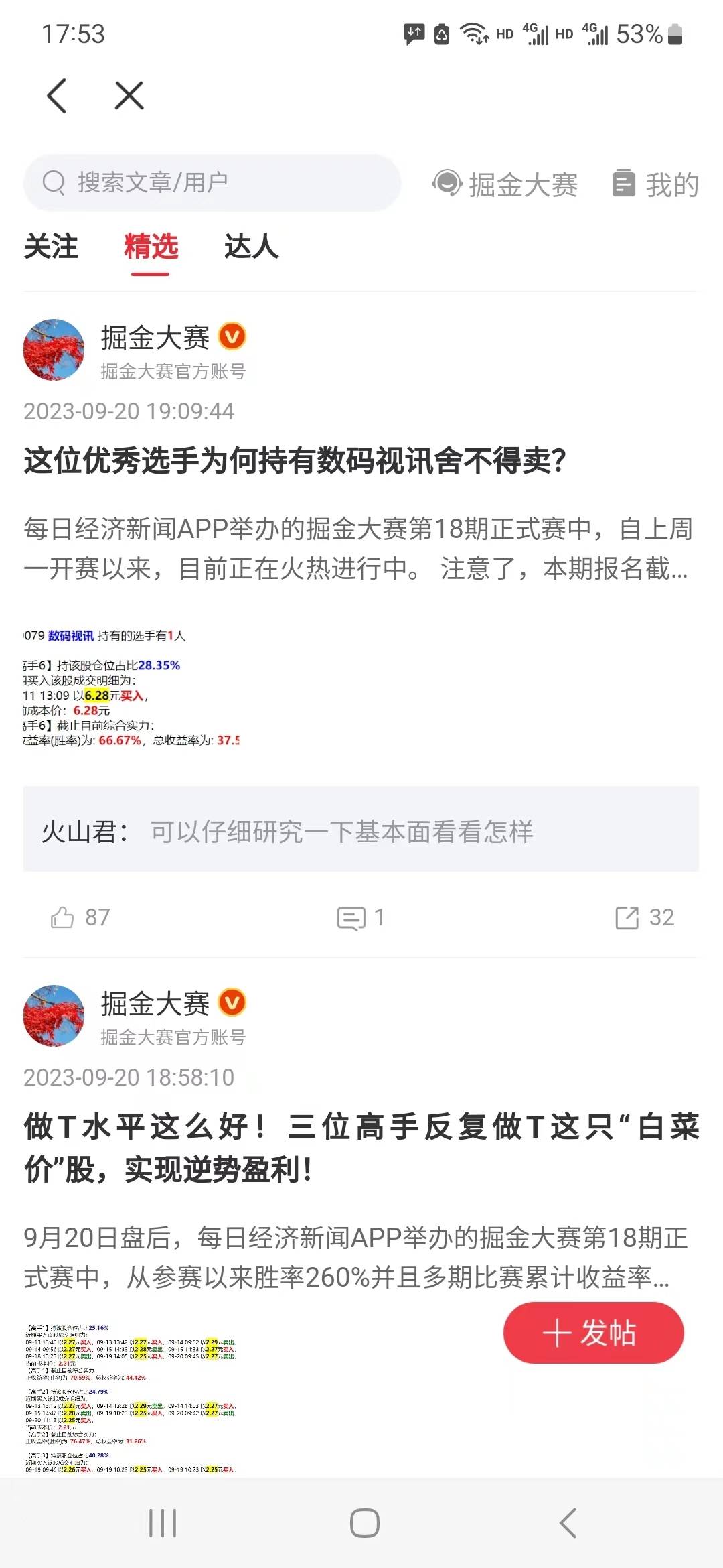 第三是公布参赛以来胜率≥60%并且多期比赛累计收益率≥30%的几位高手持仓动向。比如在9月20日晚,掘金股吧公布了某位高手持有的数码视讯一直持有舍不得卖,该公司已加入由华为牵头成立的星闪联盟,随后两个交易日,星闪概念继续受到市场追捧,数码视讯都出现上涨。