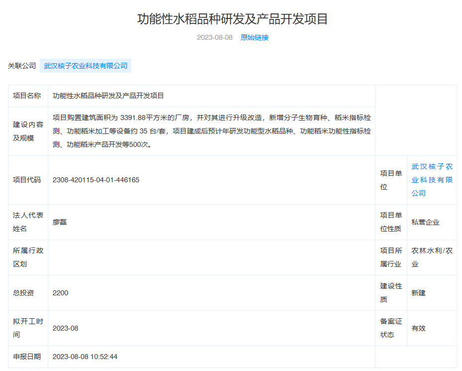 天眼查相关信息显示,武汉核子农业曾在2023年8月同时在江西、湖北省开展招标,实际招标项目均为“功能性水稻品种研发及产品开发项目”。
