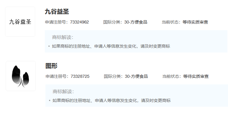 另有商标申请信息显示,公司已申请名为“九谷益圣”的文字及图形商标,国际分类均为方便食品。商标服务项目包括:方便米饭、米、米粉、谷类制品、主要由米制成的冻干食品、以米或谷物为主的零食小吃、食物制作用生迷糊以及食用芳香剂。