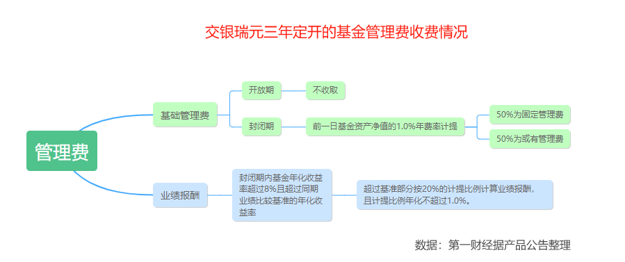 以费率改革后首只获批的浮动管理费率基金为例,交银瑞元三年定开的基金管理费由基础管理费和业绩报酬两部分组成。封闭期内,基础管理费按前一日基金资产净值的1.0%年费率计提,其中50%为固定管理费,每日计提,逐日累计至每月月末,按月支付。另外50%的部分为或有管理费,在每个封闭期的最后一日,若基金份额的期末净值小于或等于期初净值,该封闭期内的或有管理费全额返还至基金资产。