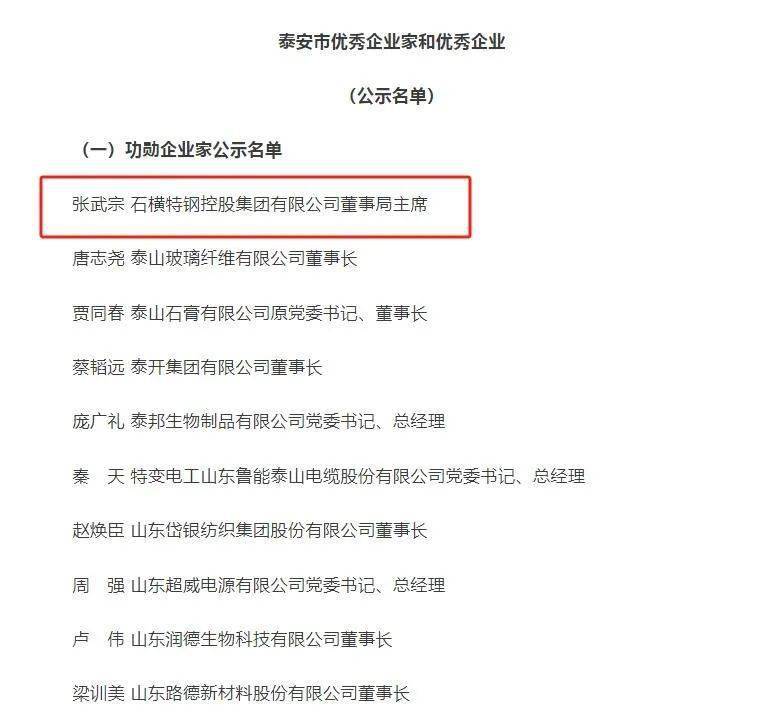 石横特钢控股集团有限公司董事局主席张武宗入选“泰安市功勋企业家”;