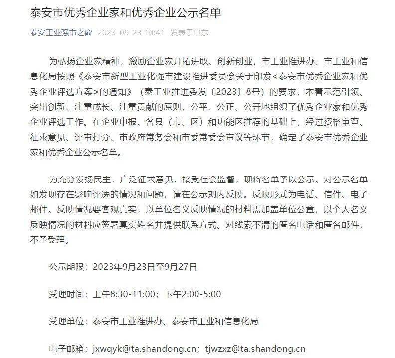 泰安市优秀企业家、优秀企业评选面向在泰安市注册的制造业企业和企业董事长、总经理等主要负责人,突出重点产业链链主企业和工业领军企业50强,特别是在新型工业化强市建设中贡献突出、社会影响力大的企业、企业家。泰安市工业推进办、市工业和信息化局本着示范引领、突出创新、注重成长、注重贡献的原则,公平、公正、公开地组织了优秀企业家和优秀企业评选工作。在企业申报、各县(市、区)和功能区推荐的基础上,经过资格审查、征求意见、评审打分、市政府常务会和市委常委会审议等环节,确定了泰安市优秀企业家和优秀企业公示名单。