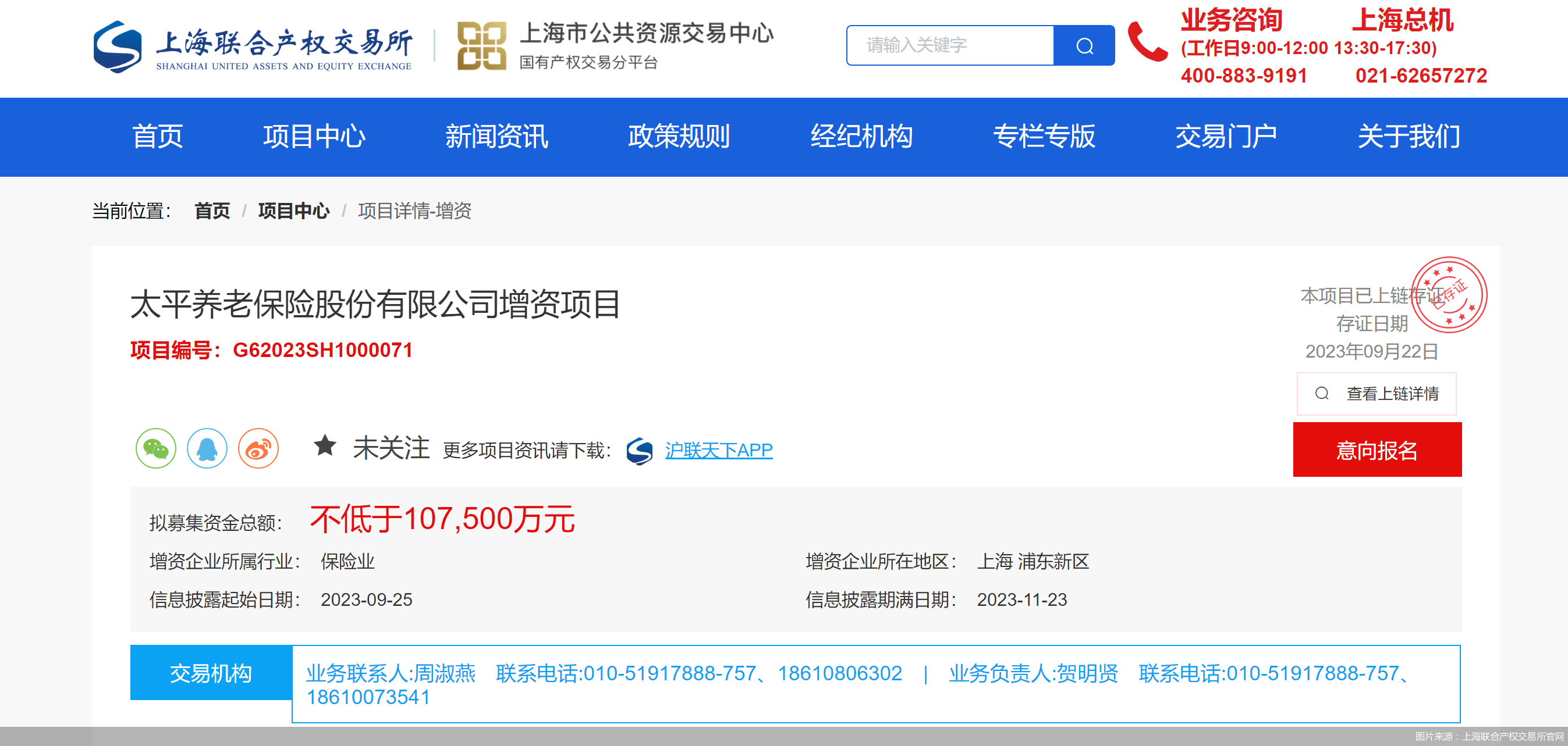 北京商报讯(记者 陈婷婷 李秀梅)9月24日,北京商报记者注意到,近日太平养老保险股份有限公司(以下简称“太平养老”)在上海联合产权交易所公布了增资扩股项目,拟募集资金总额不低于10.75亿元,新增发股份占比为增资扩股后总股份数的10%。本次增资扩股完成后,太平养老外部新增股东持股比例为10%,原股东持股比例为90%。