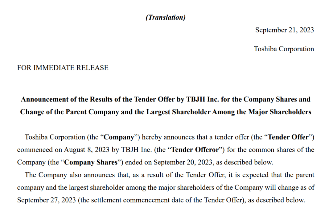 9月21日,据东芝公司官网新闻稿,由私募股权基金“日本产业合作伙伴(JIP)”牵头的150亿美元要约收购已获得成功,超过一半的股东参与此次收购,达到将公司私有化的门槛。该财团将从结算开始的27日正式成为东芝母公司及其最大股东。