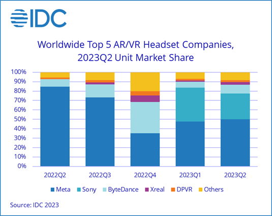 IT之家注意到,Meta 作为市场领导者的地位没有改变,因为该公司在 2023 年第二季度拥有 50.2% 的市场份额。然而,该公司确实面临着来自索尼(27.1% 的市场份额)和字节跳动(PICO 9.6% 的份额)的挑战,这两家公司在 2023 年第二季度的市场份额都有所增长。排在第四、第五位的分别是 Xreal(原 Nreal)和大朋 VR,市场份额均略高于 2%。