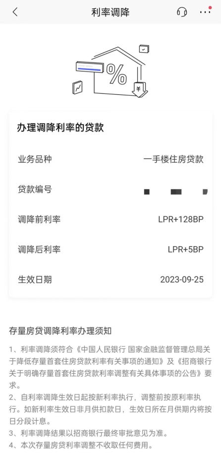 郑州存量房贷客户王先生向记者展示了他在招商银行手机银行App查询到的利率调整信息,上面显示调整前利率为LPR+128BP,调整后利率为LPR+5BP,生效日期为2023年9月25日。