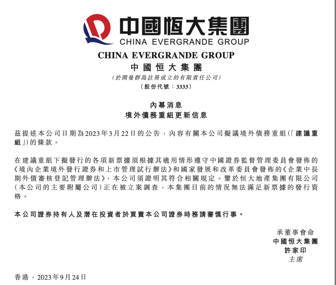 中国恒大9月24日晚间公告,鉴于附属公司恒大地产集团正在被立案调查,集团目前的情况无法满足新票据的发行资格。
