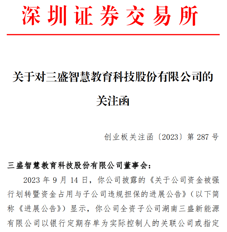 9月14日,深交所对三盛教育下发关注函,围绕其全资子公司三盛新能源,因银行承兑汇票出票人到期未能兑付,4.45亿元被银行强行划转相关事项提出质疑。