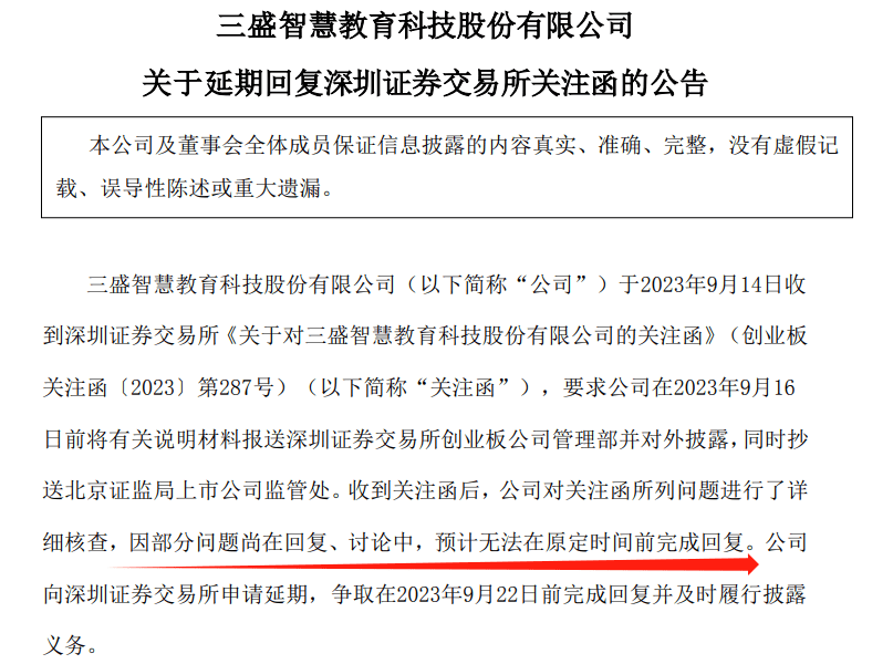 深交所要求公司在2023年9月16日前回复相关问题并对外披露。但随后,三盛教育发布《关于延期回复深交所关注函的公告》称,部分问题尚在回复、讨论中,预计无法在原定时间前完成回复。
