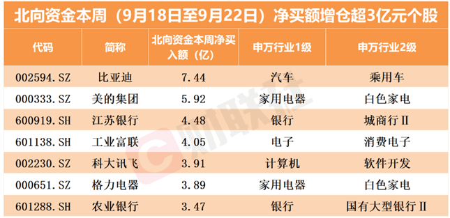 银行股9月18日-9月22日获得逾12亿元的净买入,为唯一净买入超10亿元的行业,汽车、传媒、家用电器、计算机等行业也获得超亿元净买入。医药生物、电气设备两行业被大幅净卖出超20亿元,食品饮料、化工、非银金融三行业则被净卖出超10亿元。