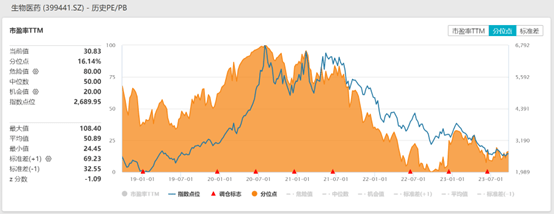 指数估值方面,标的指数国证生物医药指数(399441) PE-TTM值30.83倍,位于近5年16.14%百分位,估值性价比仍旧较高。