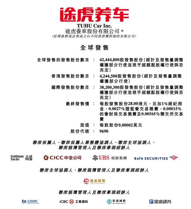 上证报中国证券网讯(记者 俞立严)9月25日,途虎养车在港交所公告,香港IPO最终发售价已厘定为每股28港元,将自全球发售收取的所得款项净额估计约为10.81亿港元。途虎养车根据香港公开发售初步提呈发售的香港发售股份已获约2.67倍超额认购,预期A类股份将于2023年9月26日(星期二)上午九时正在联交所开始买卖,股份代号为9690。