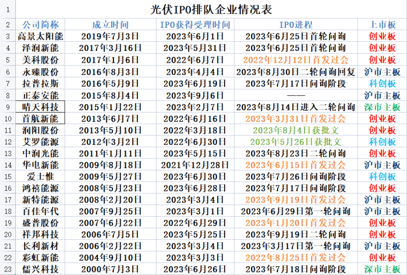据不完全统计,目前美科股份、润阳股份、首航新能、艾罗能源、彩虹新能、华电新能、盛普股份、长利新材、晴天科技、、百佳年代、永臻股份、中润光能、祥邦科技、泽润新能、高景、拉普拉斯、儒兴科技、鸿禧能源、爱士惟、正泰安能等21家光伏企业正在沪深两市排队IPO,预计融资额接近900亿元。上述企业,七成以上为今年开始申报,时间主要集中在2月至6月期间。