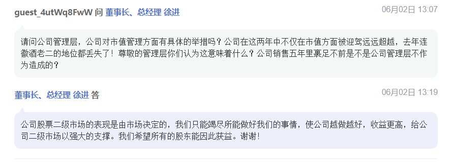心急如焚的投资者甚至发出质问:“公司对市值管理方面有具体的举措吗?公司在这两年中不仅在市值方面被迎驾远远超越,去年连徽酒老二的地位都丢失了!你们认为这意味着什么?公司销售五年里裹足不前是不是公司管理层不作为造成的?”
