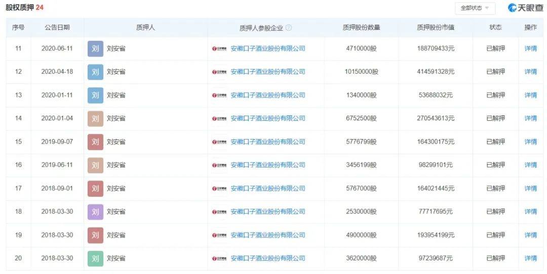 2018年2月,质押给如日中天的17,999,092股解除。一个月后,他又将27,010,000股质押给海通证券。4月,又向海通资管质押了10,150,000股。8月,口子窖解禁潮来临,随之而来的就是原始股东的减持潮,刘安省也减持了2,399,943股,套现9302.16万元。