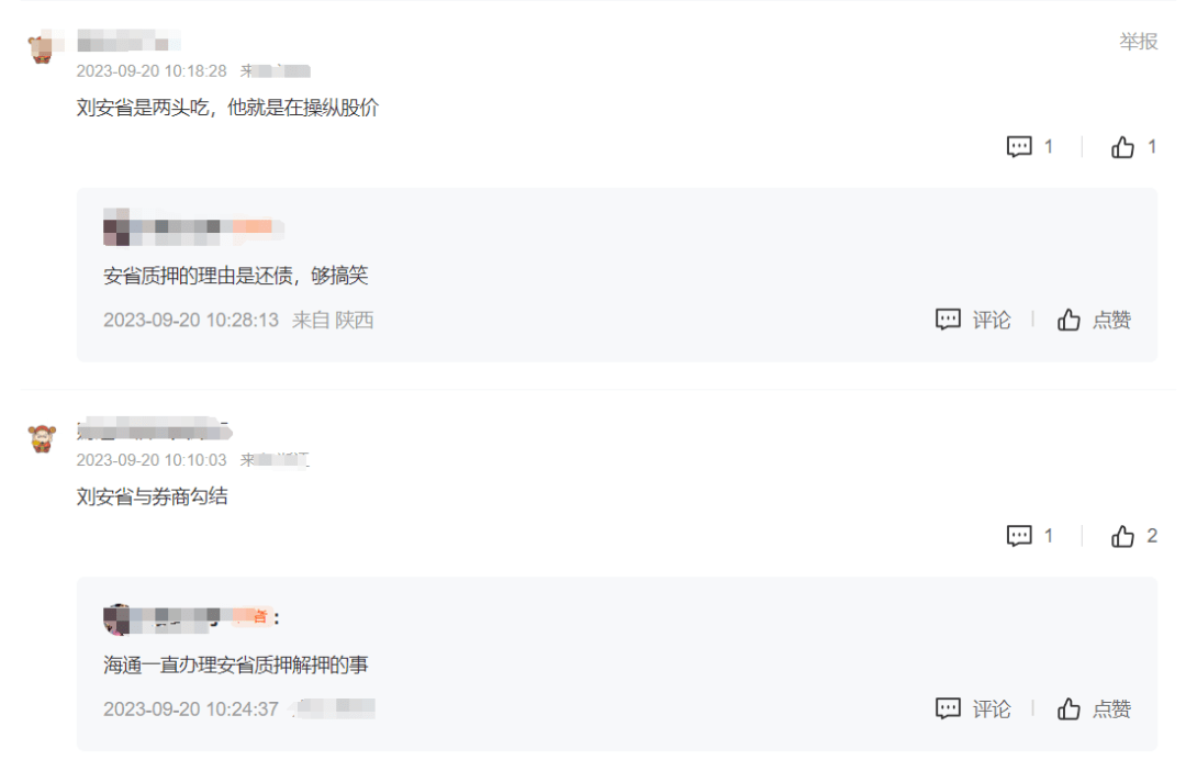 2021年,为了偿还债务,刘安省又向海通证券质押了三次,另因个人资金需求质押一次。2022年,刘安省展期三次,又新增一次质押。