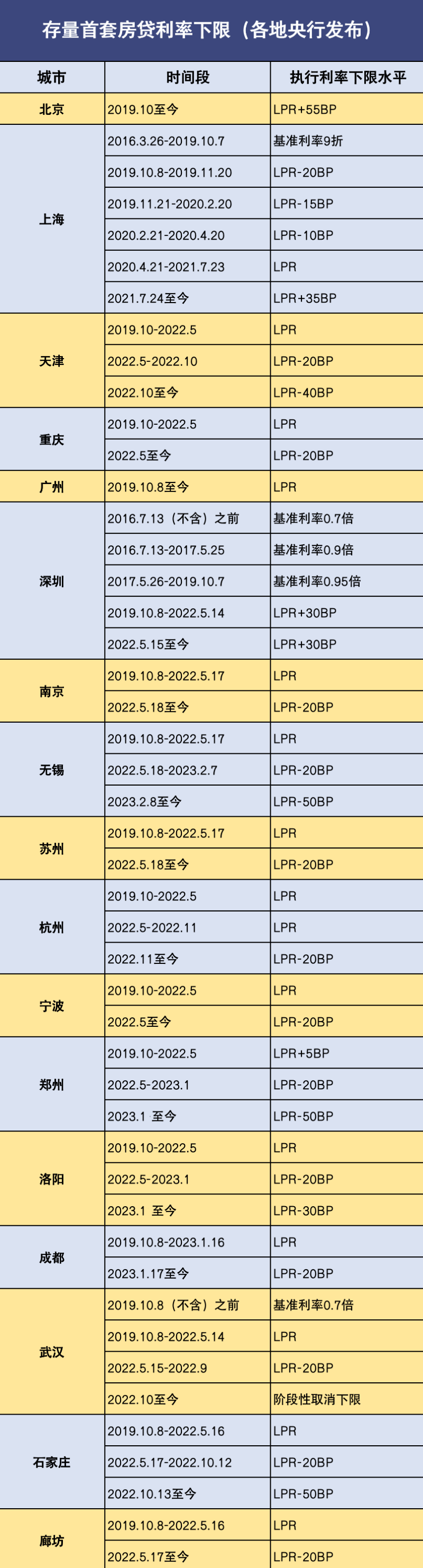 央行上海分行也公布了上海首套商业性个人住房贷款利率自律下限有关情况;其中2021.7.24至今上海执行的利率下限水平为LPR+35BP。央行深圳市分行对深圳市首套房贷利率下限历史调整情况进行公示。2019年10月8日至今,深圳市执行利率下限水平为LPR+30BP。