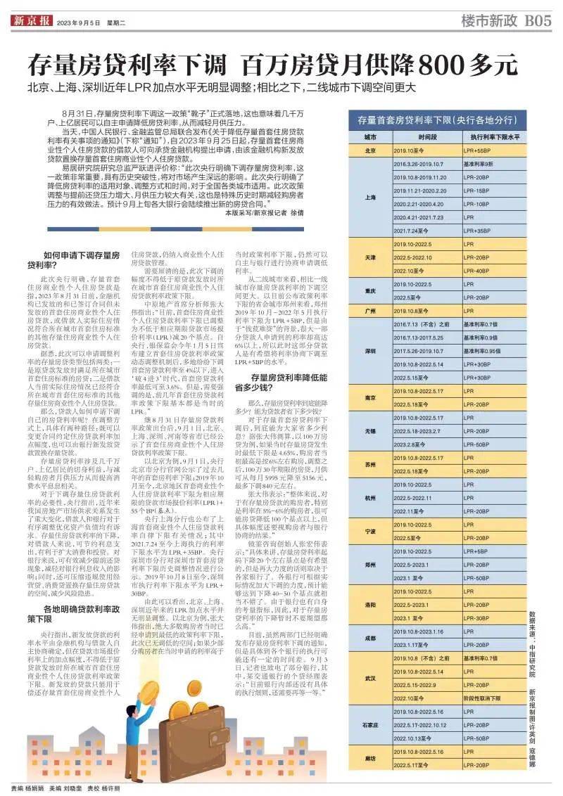 8月31日,中国人民银行、金融监管总局联合发布《关于降低存量首套住房贷款利率有关事项的通知》(下称“通知”),自2023年9月25日起,存量首套住房商业性个人住房贷款的借款人可向承贷金融机构提出申请,由该金融机构新发放贷款置换存量首套住房商业性个人住房贷款。