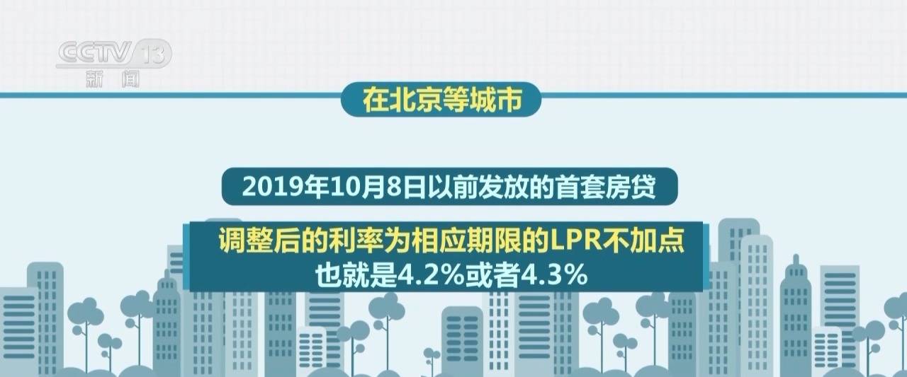 在北京等城市,2019年10月8日以前发放的首套房贷,调整后的利率为相应期限的LPR不加点,也就是4.2%或者4.3%;2019年10月8日及以后发放的首套房贷,调整后的利率为相应期限的LPR+55个基点,也就是4.75%或4.85%。