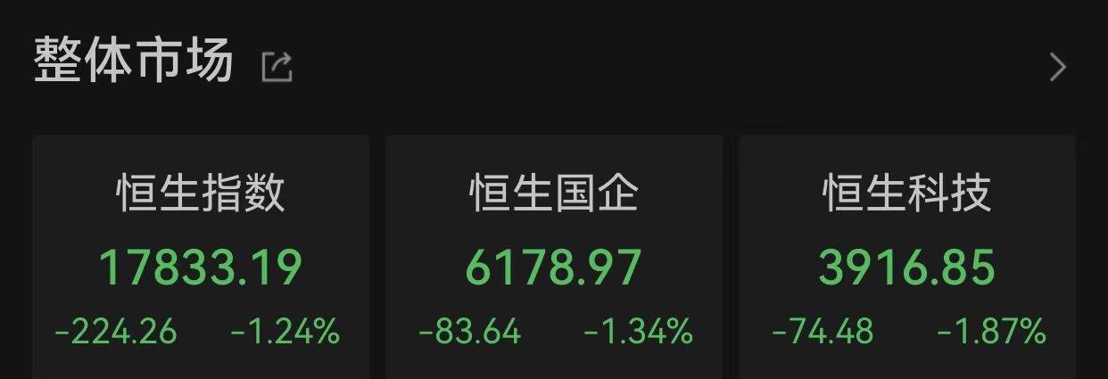 截至午盘,恒指跌1.24%报17833.19点,恒生国企指数跌1.34%报6178.97点,恒生科技指数跌1.87%报3916.85点。