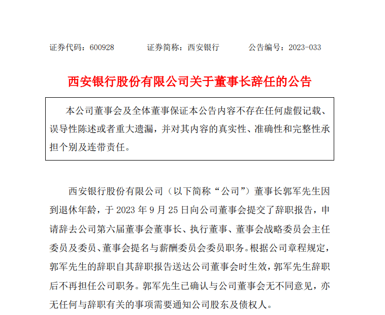 9月25日,西安银行(600928.SH)发布公告称,公司董事长郭军因到退休年龄,于9月25日向董事会提交了辞职报告,申请辞去西安银行第六届董事会董事长、执行董事、董事会战略委员会主任委员及委员、董事会提名与薪酬委员会委员职务。