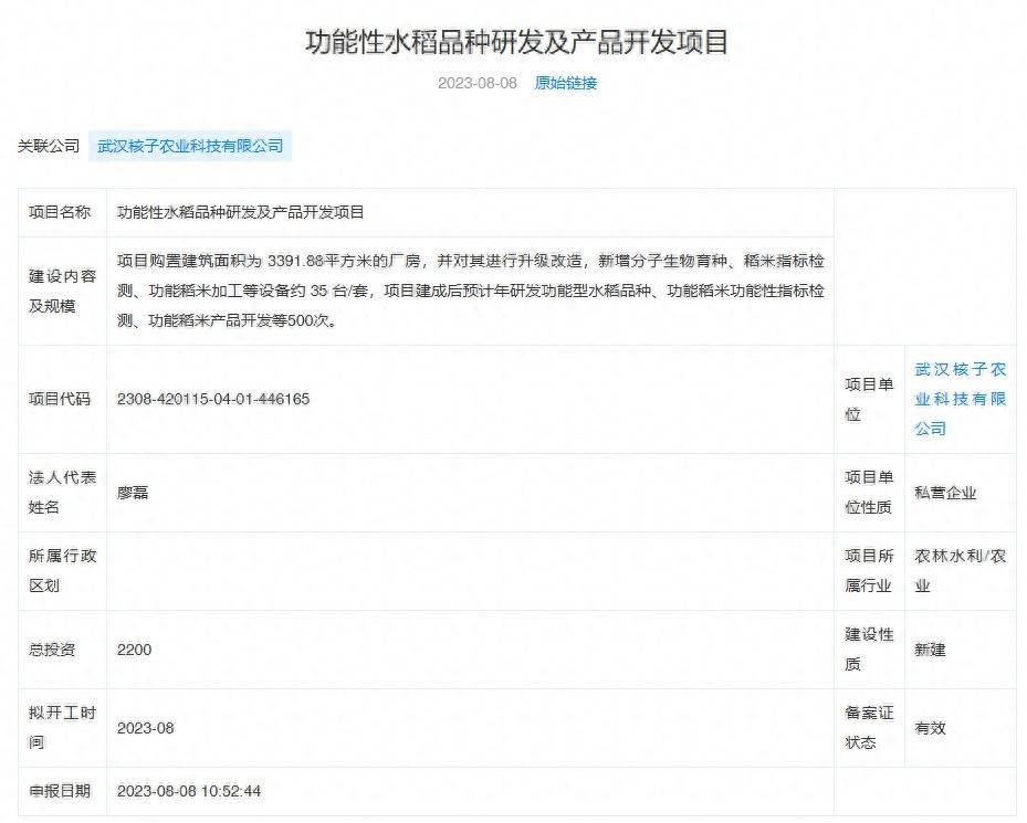 在2023年核子集团新注册的8家子公司中,武汉核子农业科技有限公司(下称:武汉核子农业)涉及相关内容。该公司成立于2023年5月22日,由核子基因母公司深圳市核子基因科技有限公司直接控股,法定代表人为廖磊,注册资本500万人民币。