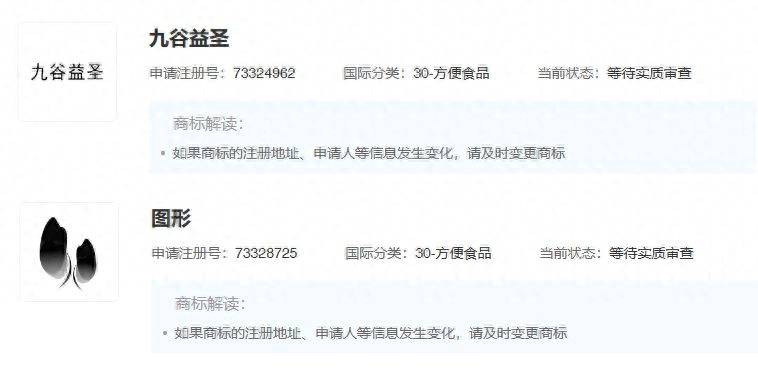 另有商标申请信息显示,公司已申请名为“九谷益圣”的文字及图形商标,国际分类均为方便食品。商标服务项目包括:方便米饭、米、米粉、谷类制品、主要由米制成的冻干食品、以米或谷物为主的零食小吃、食物制作用生迷糊以及食用芳香剂。