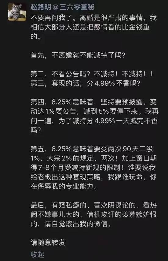 三六零公司董秘当天在朋友圈言辞激烈的回应减持传闻,表示如果要帮助老板减持套现,这个方案便是对自己专业能力的侮辱。