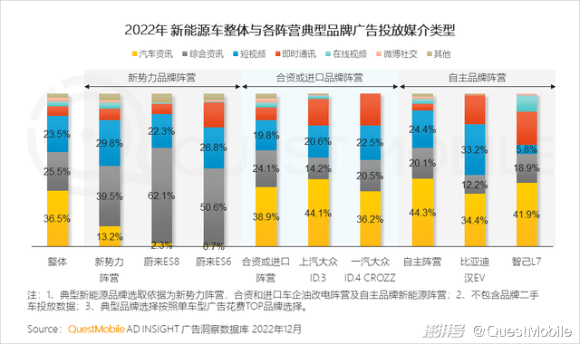 据QuestMobile的报告显示,2022年以智能化为主打的造车新势力,在品牌营销已经转向到更多元、受众更广的媒体平台。在综合资讯平台和短视频平台上,加大力度投入。而传统车厂仍更注重于投放在受众更为专业的汽车资讯平台。