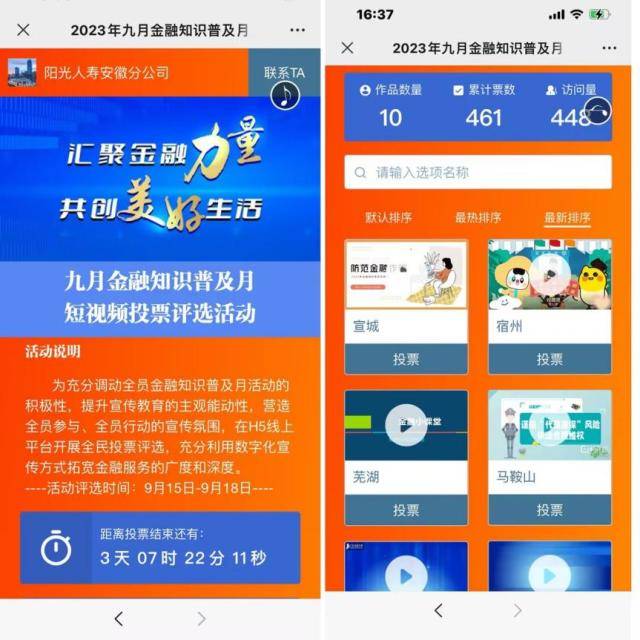 宣传活动启动以来,阳光人寿各级机构职场柜面电子屏、电视均滚动播放活动口号,张贴悬挂活动海报,摆放各类宣传教育折页,营造浓厚的活动氛围。线上,阳光人寿通过官微、“我家阳光”APP发布“以案说险”“风险提示”文章,扩大宣传覆盖面;开展“金融知识达人”有奖问答活动,消费者通过参与互动答题,可轻松学习金融知识。此外,各分公司借助自有线上平台开展宣教活动,如阳光人寿安徽分公司向各中支征集金融知识优秀短视频,开展全民线上投票评选活动,通过转发、评论提升活动参与率和覆盖率。