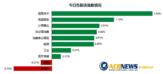 盘面显示,科技板块午盘反弹,帮助澳洲股市收复了早盘原材料板块的跌幅,最终大盘小幅走高。